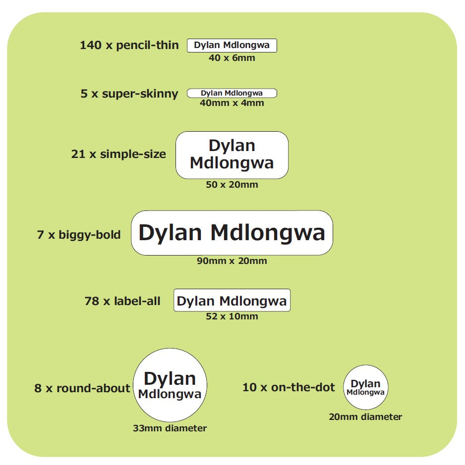 The set offers a variety of shapes and sizes to label all your children's school items, from pens and pencils to text books and lunch boxes. These labels ensure quick, easy and clear marking of items.