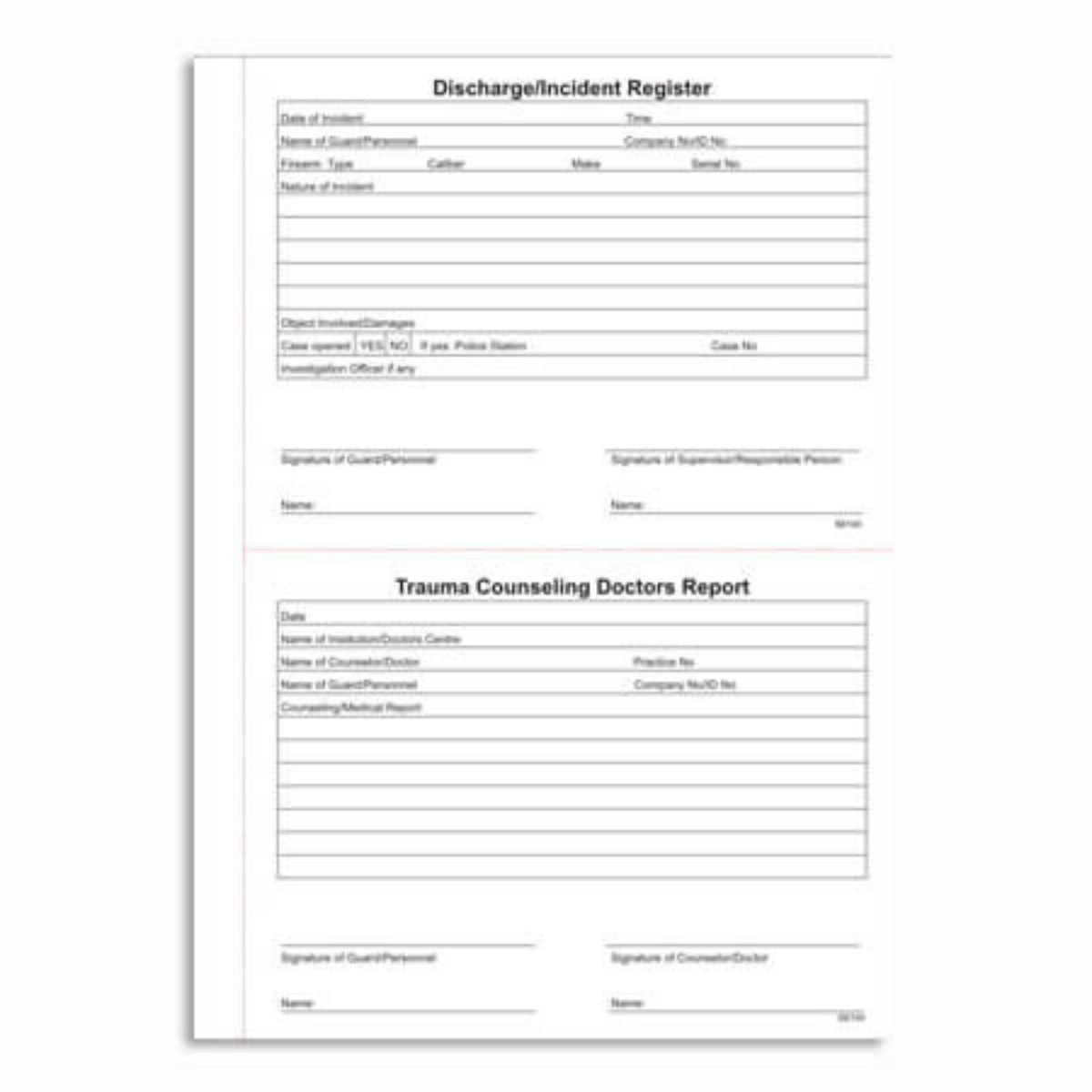 RBE’s side stitched and bound A4 Firearm Discharge & Incident Report with Doctors Trauma Counselling Report included.